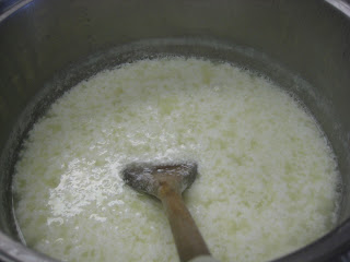 We began by pouring goat's milk in a big pot.